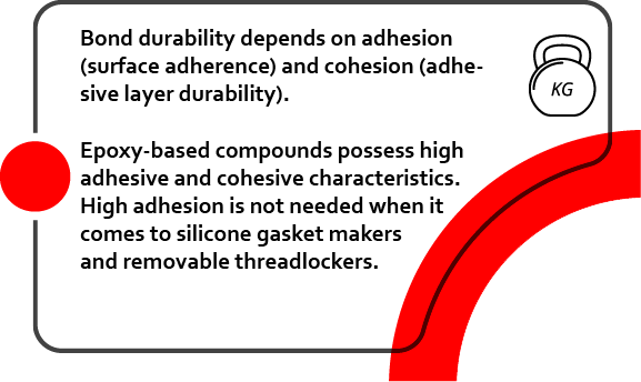 Bond durability depends on adhesion (surface adherence) and cohesion (adhesive layer durability). Epoxy-based compounds possess high adhesive and cohesive characteristics. High adhesion is not needed when it comes to silicone gasket makers and removable threadlockers.