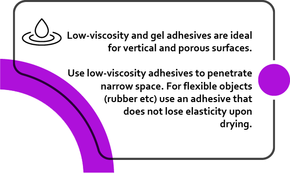Low-viscosity and gel adhesives are ideal for vertical and porous surfaces. Use low-viscosity adhesives to penetrate narrow space. For flexible objects (rubber etc) use an adhesive that does not lose elasticity upon drying.