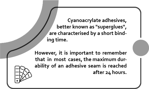 Cyanoacrylate adhesives, better known as "superglues", are characterised by a short binding time. However, it is important to remember that in most cases, the maximum durability of an adhesive seam is reached after 24 hours.